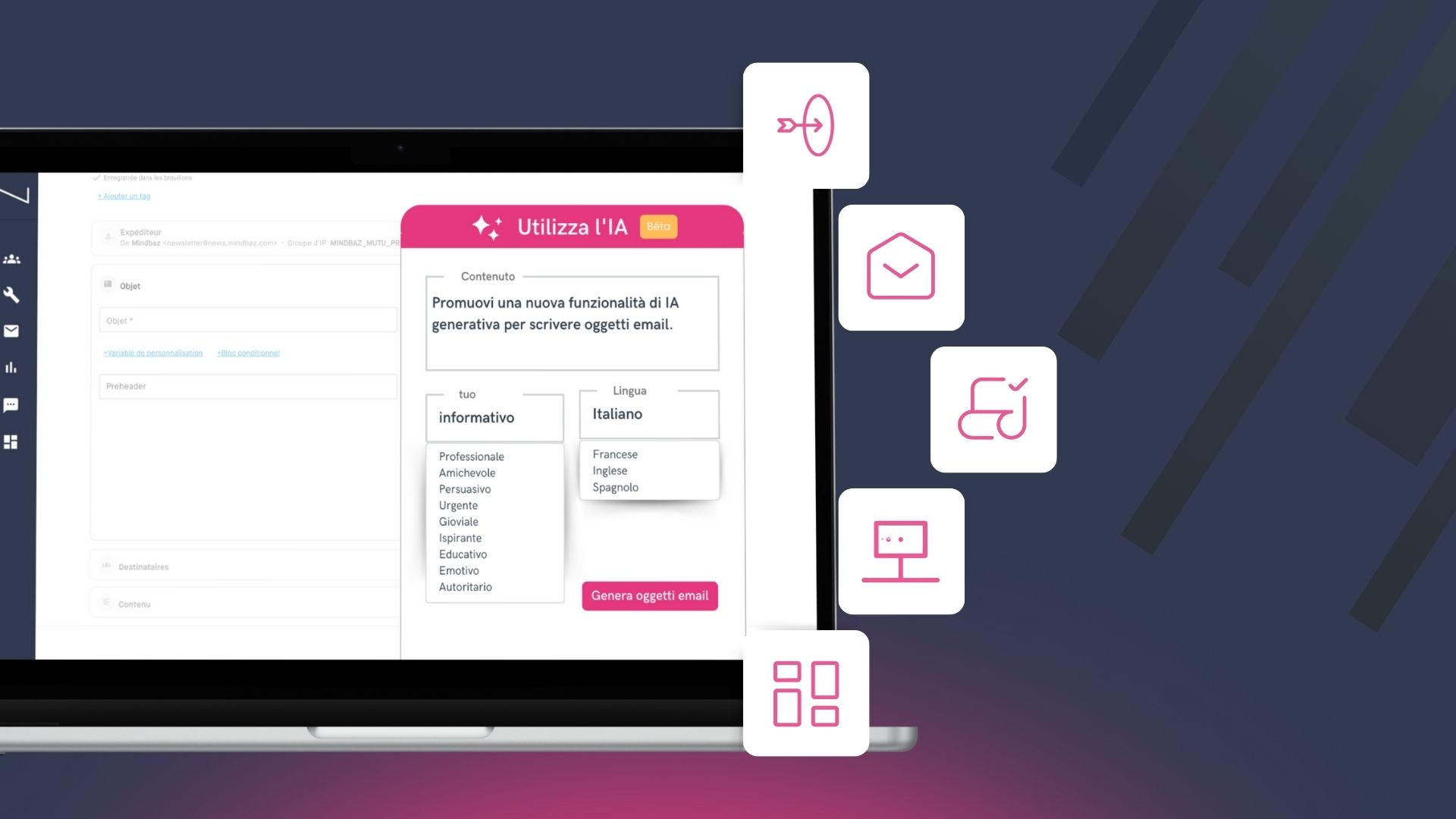 Genera oggetti email originali e performanti con la nostra funzione di IA generativa, disponibile in versione beta e gratuita!